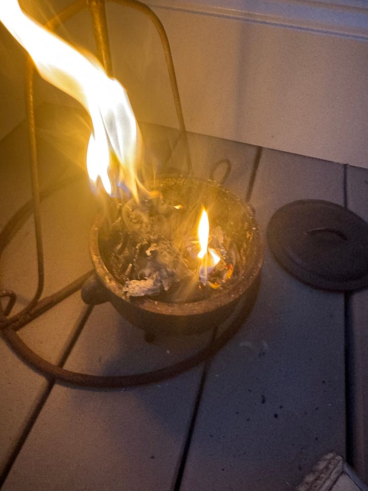 I took it out and started thinking about what to do with it. Donating didn’t feel right. But in feng shui, we love rituals — especially ones that invoke the element of fire, which transmutes energy. So out came my witchy cauldron, where I burned the book cover.